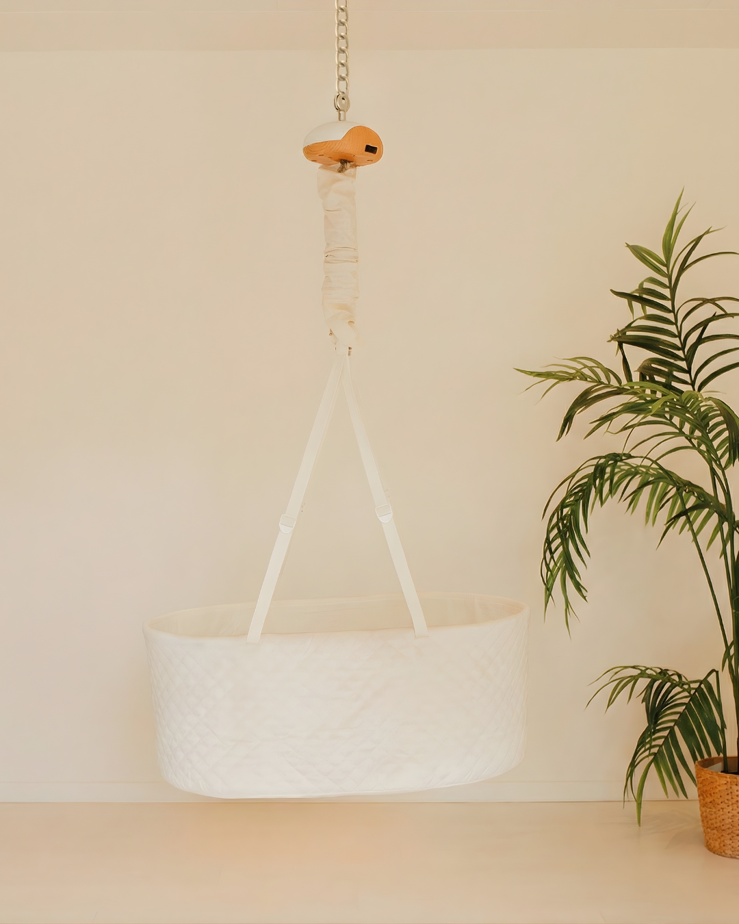 Stabil Oval vugge med flad bund, justerbar ophængsstrop og støjsvag Balance Vuggemotor – kombineret med diskret loftophæng for maksimal fleksibilitet i hjemmet.