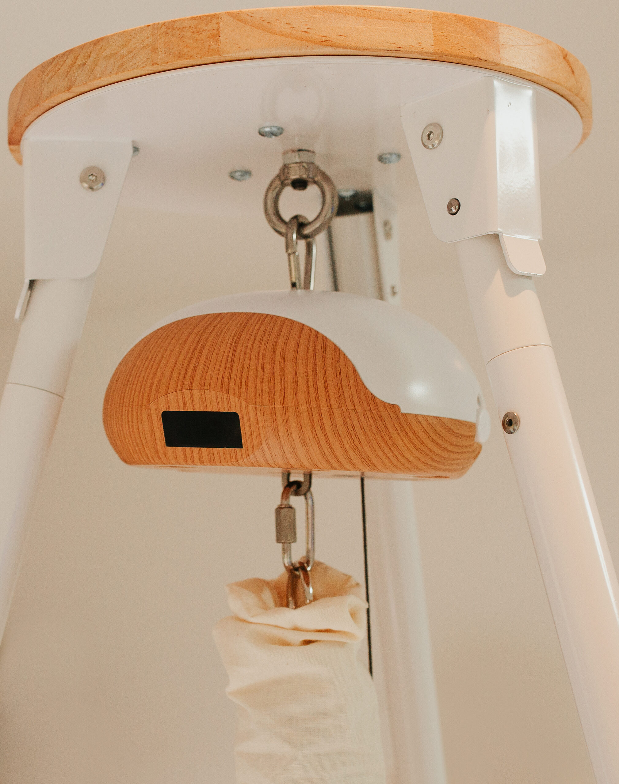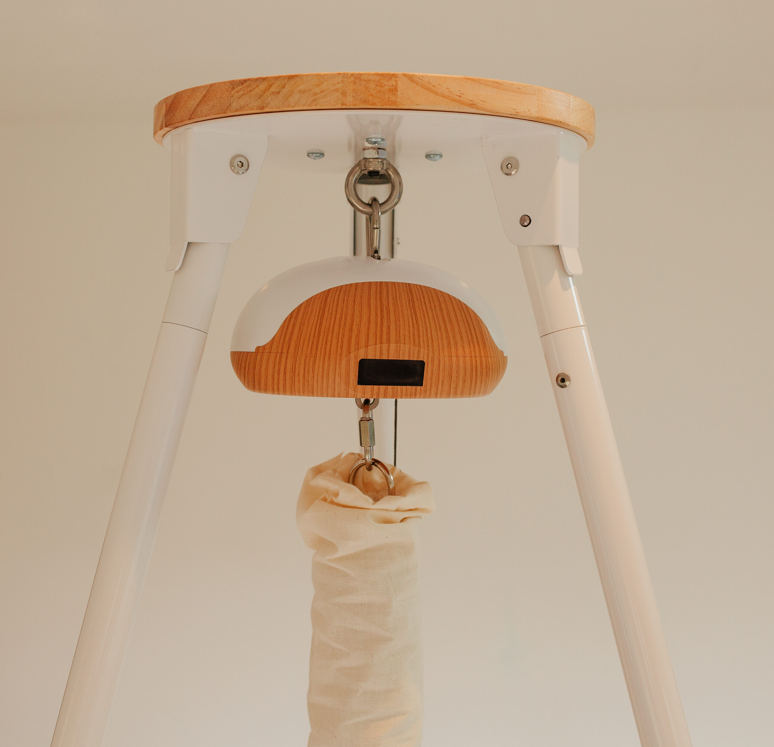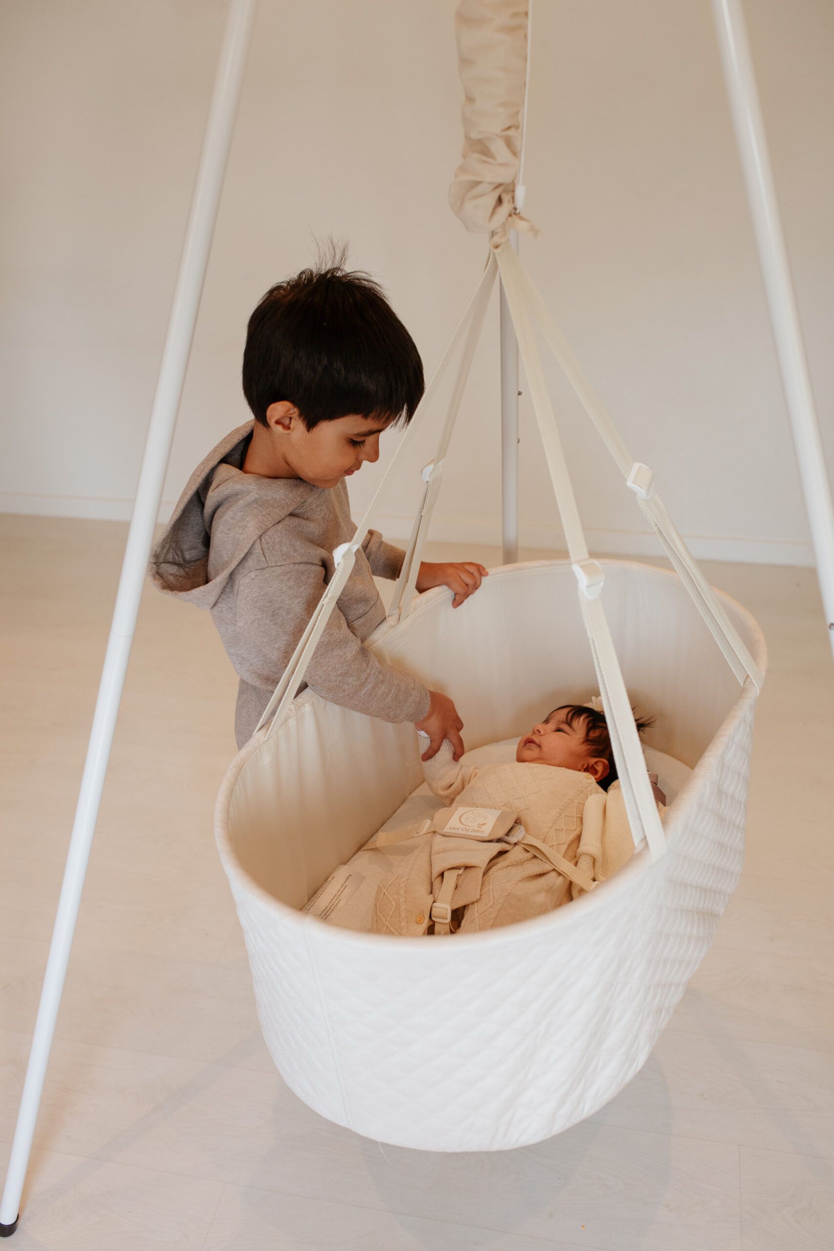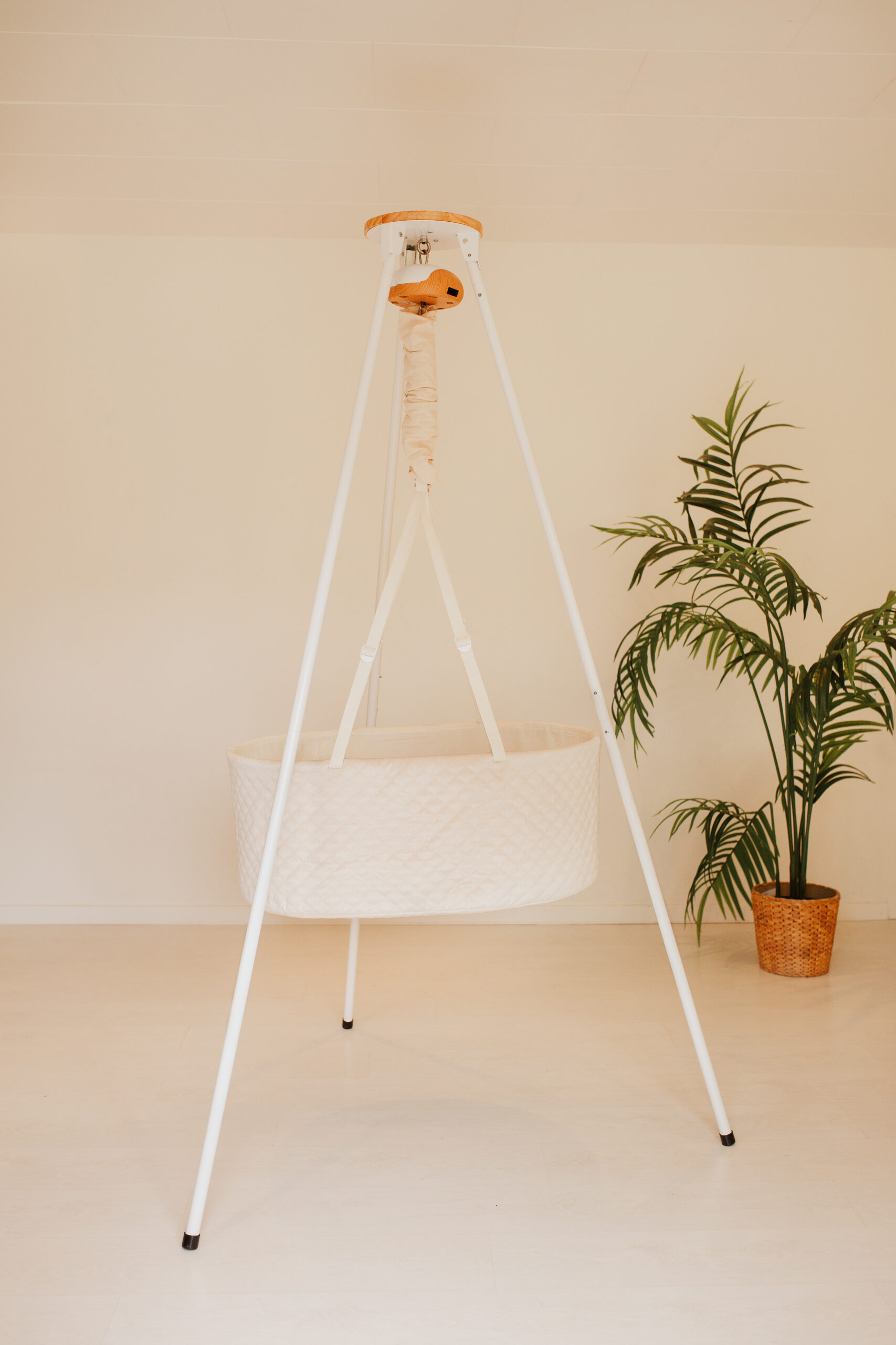Stabil Oval vugge med flad bund, justerbar ophængsstrop og støjsvag Balance Vuggemotor – kombineret med solid tripod-stativ for maksimal fleksibilitet i hjemmet.