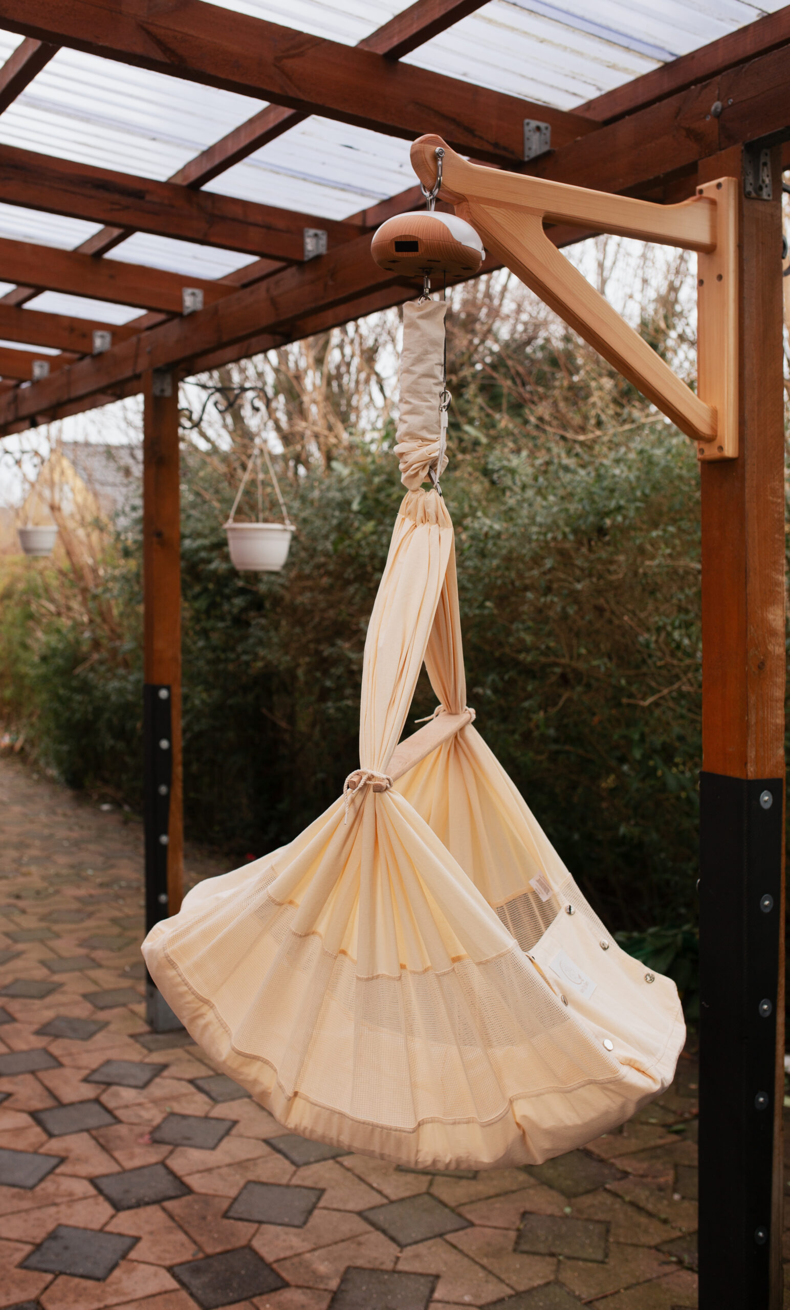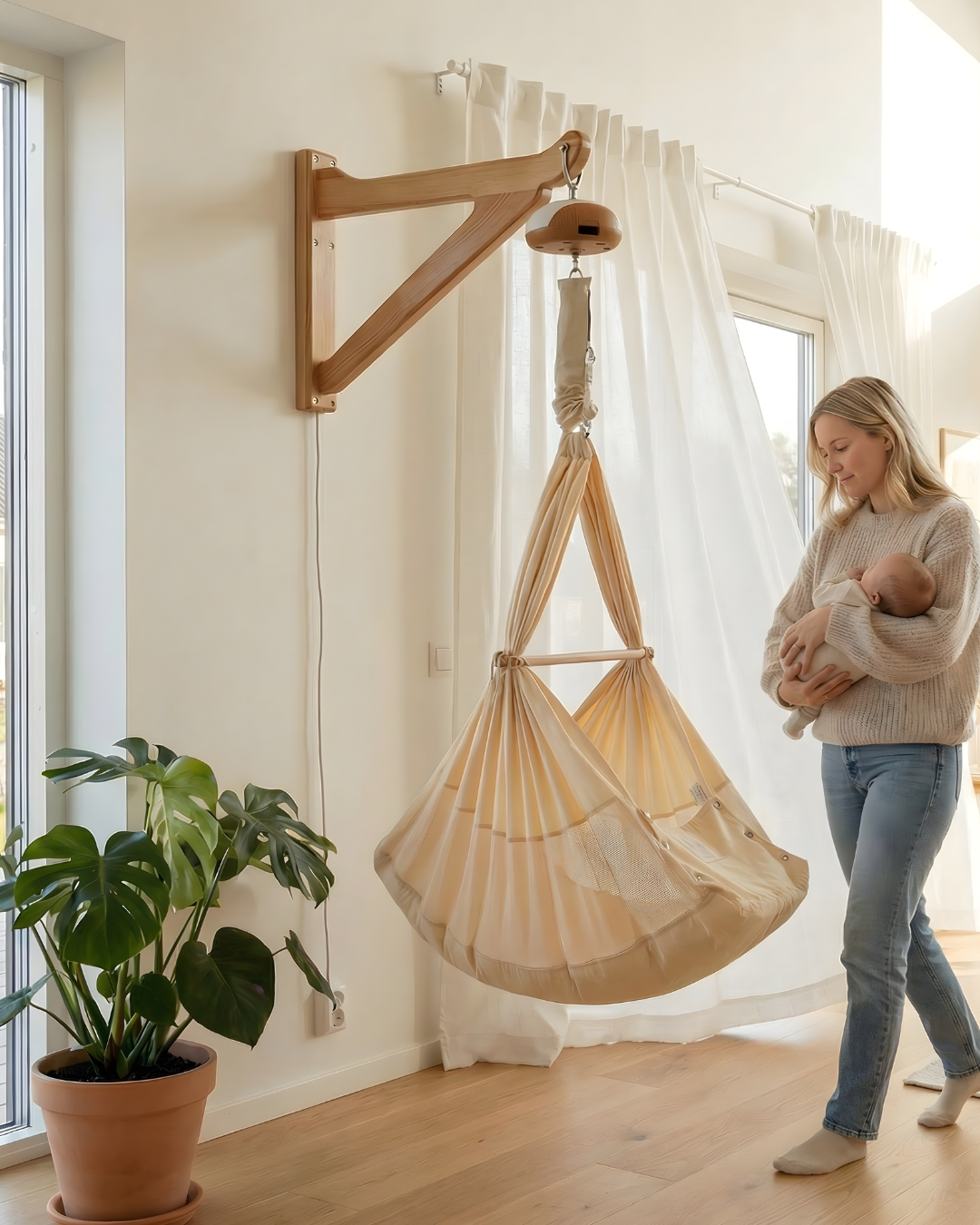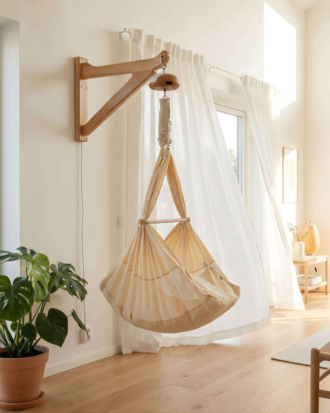 Slyngevugge i blød bomuld med åndbare mesh-paneler og certificeret bomuldsmadras og støjsvag Balance Vuggemotor – kombineret med vægmonteret træarm i skandinavisk design – stabil, æstetisk og fleksibel til både inde- og udendørs brug.