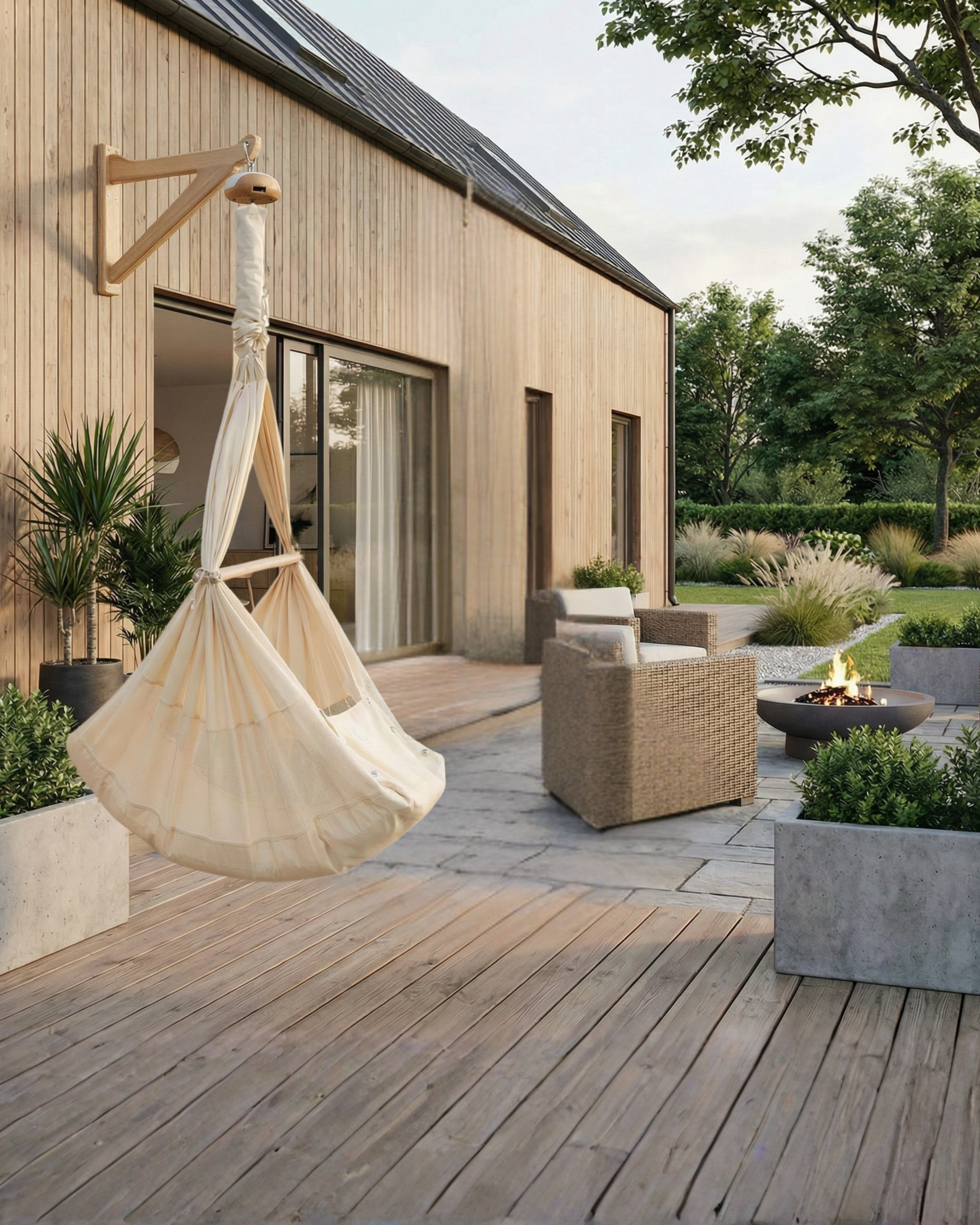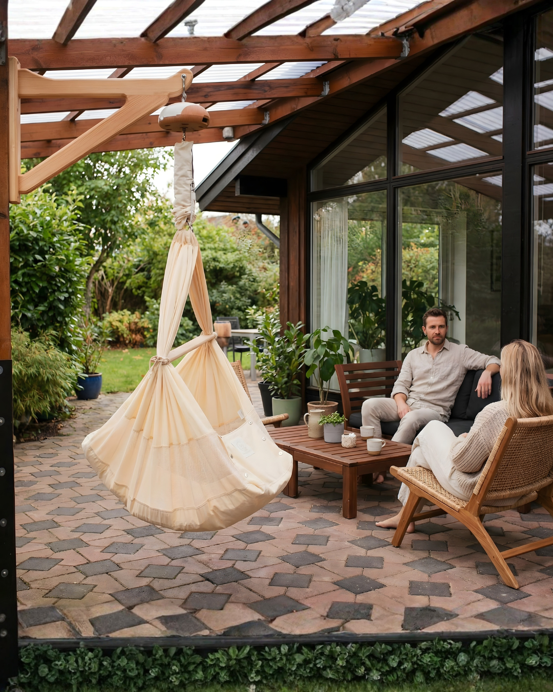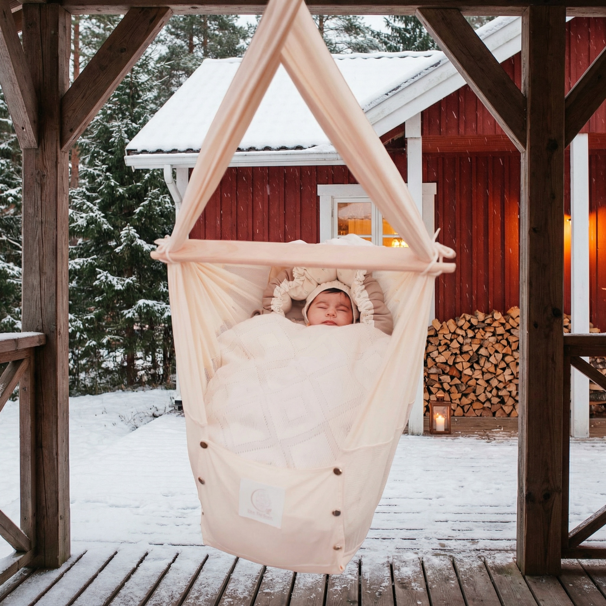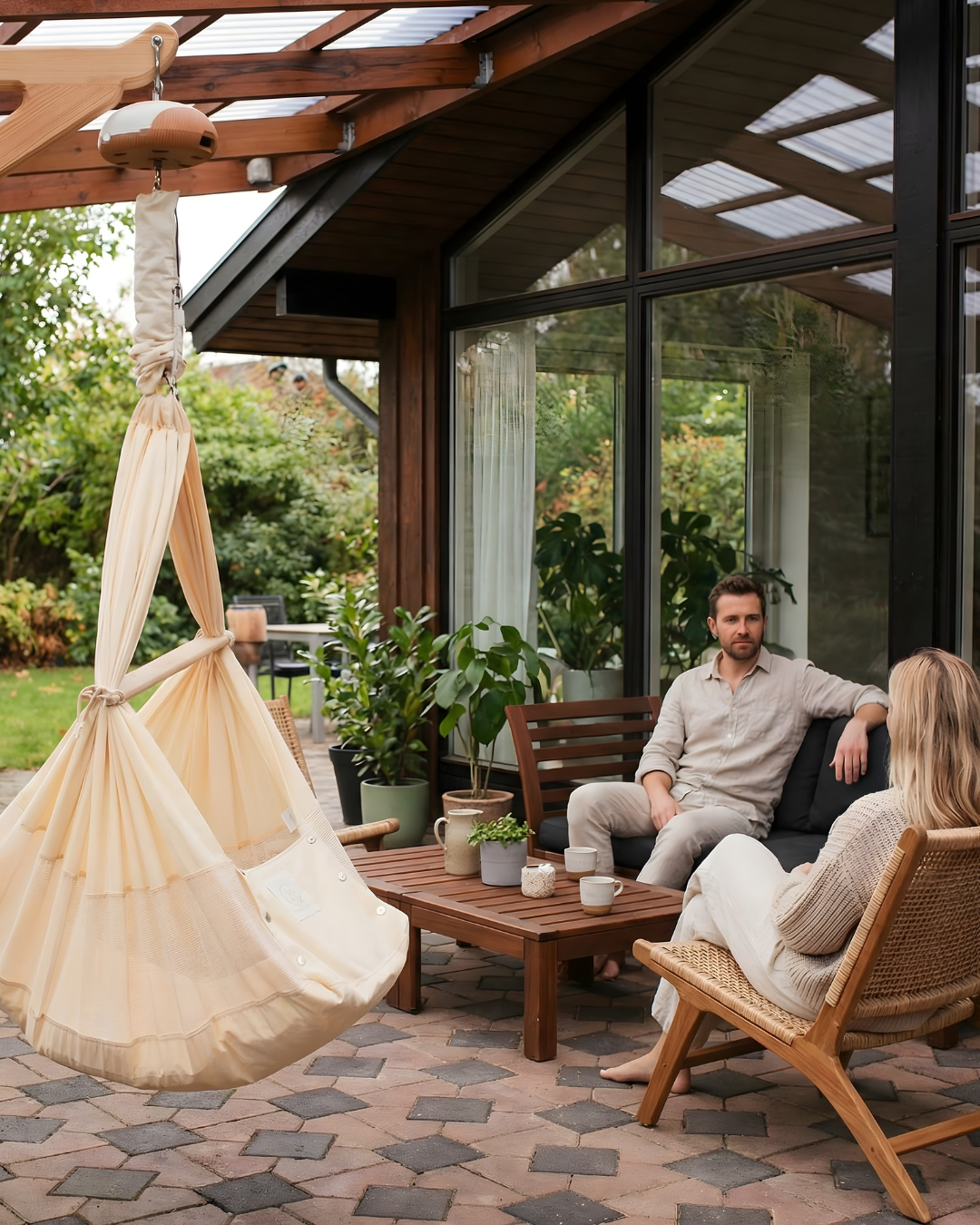 Slyngevugge i blød bomuld med åndbare mesh-paneler og certificeret bomuldsmadras og støjsvag Balance Vuggemotor – kombineret med vægmonteret træarm i skandinavisk design – stabil, æstetisk og fleksibel til både inde- og udendørs brug.