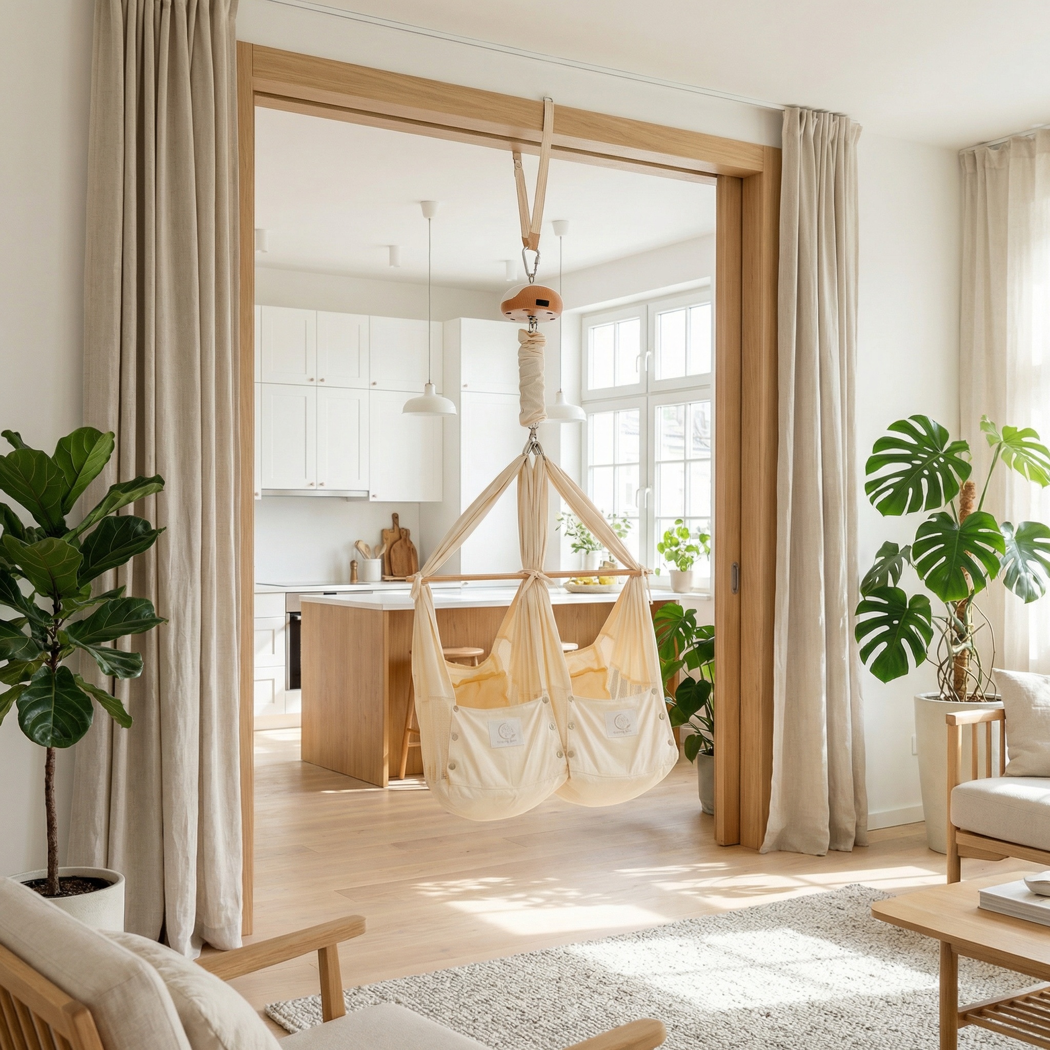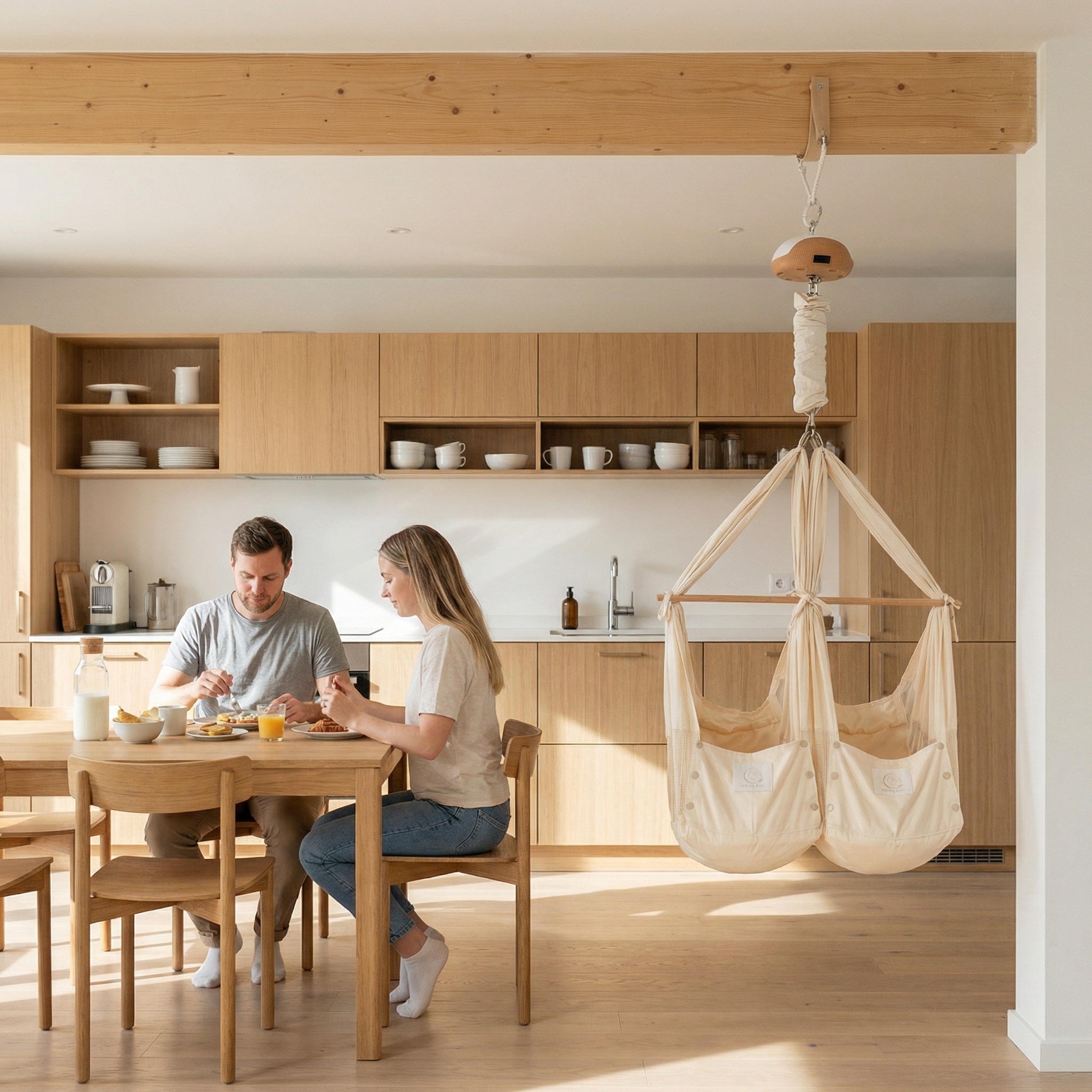 Tvillingeslyngevuggen er udviklet til familier med tvillinger eller to små babyer. Designet giver begge børn en tryg og balanceret soveplads side om side, samtidig med at den blide bevægelse hjælper med at skabe en rolig rytme i hverdagen.