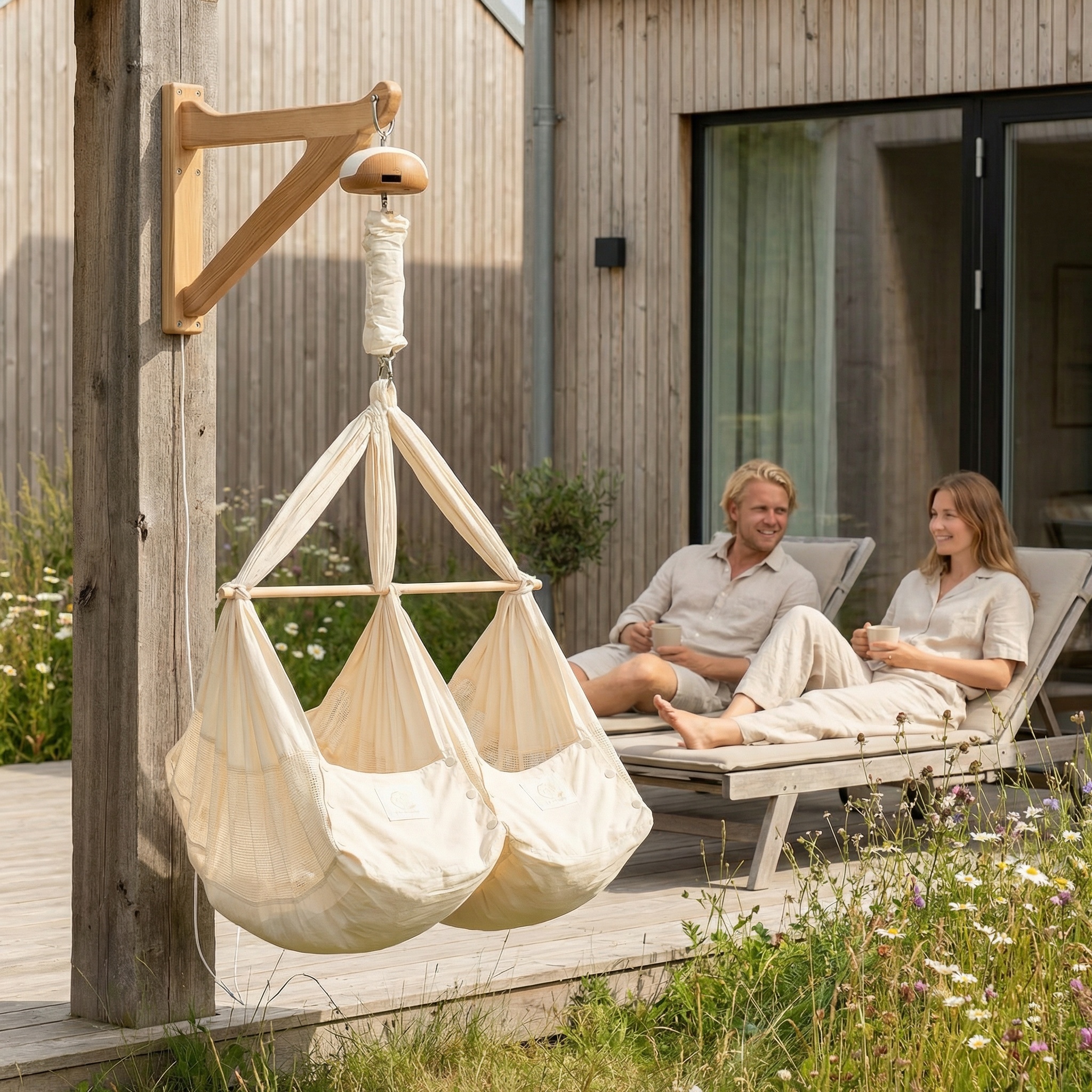 Leje TvillingeSlyngevugge – Vægmonteret skandinavisk træarm (indendørs/udendørs) med Balance Vuggemotor | Mor Og Børn