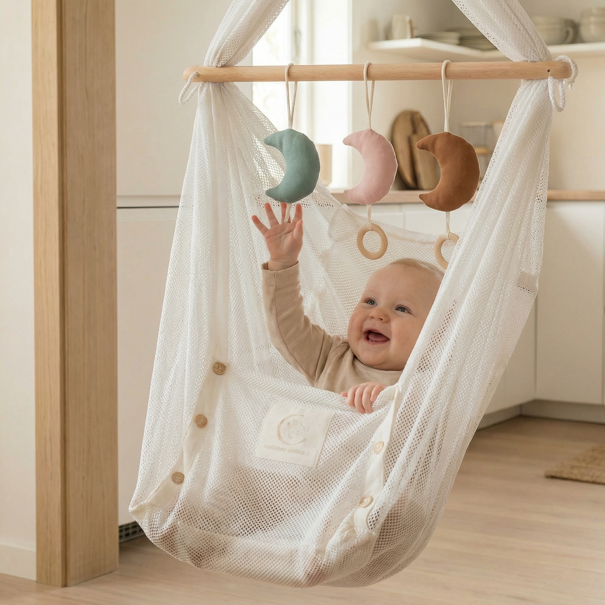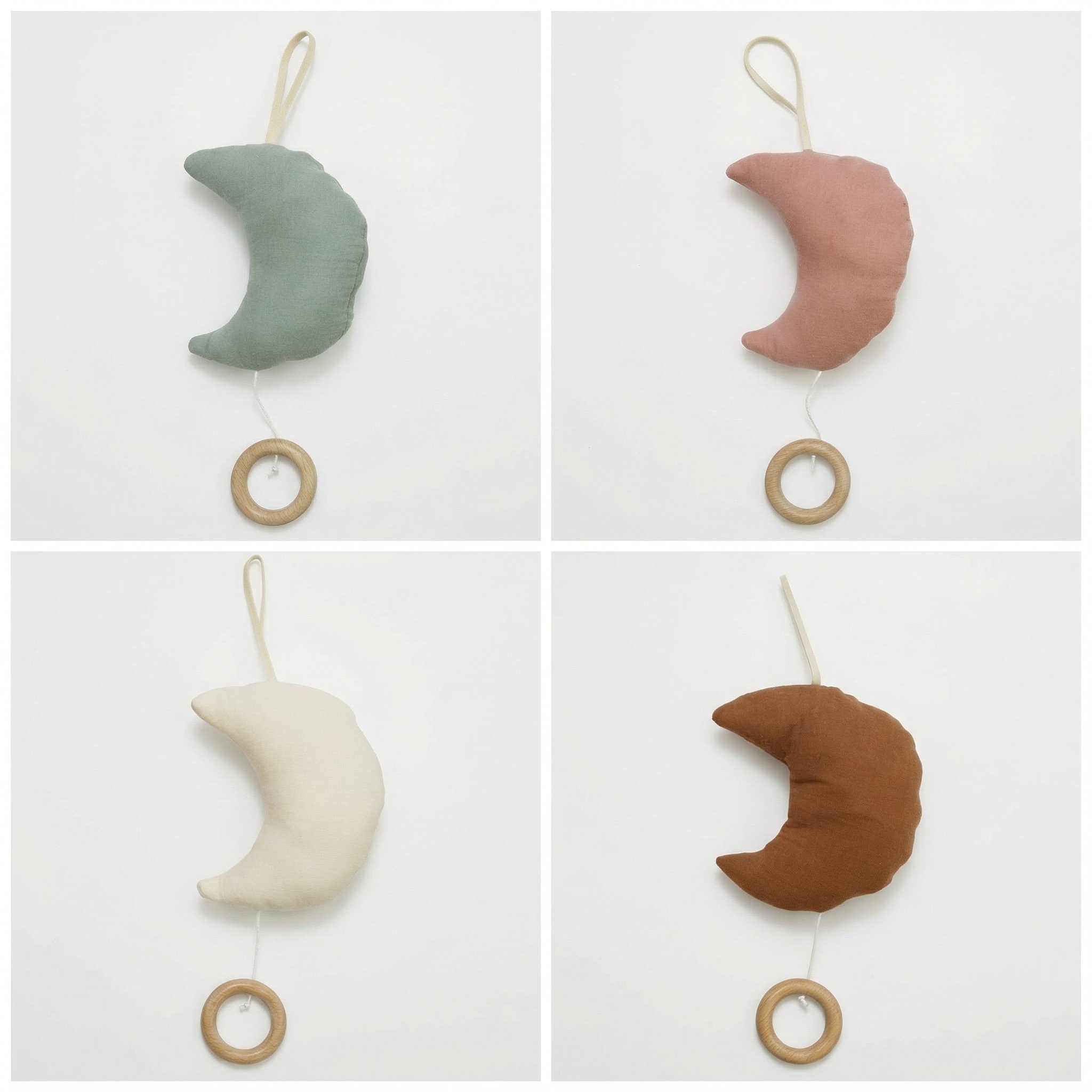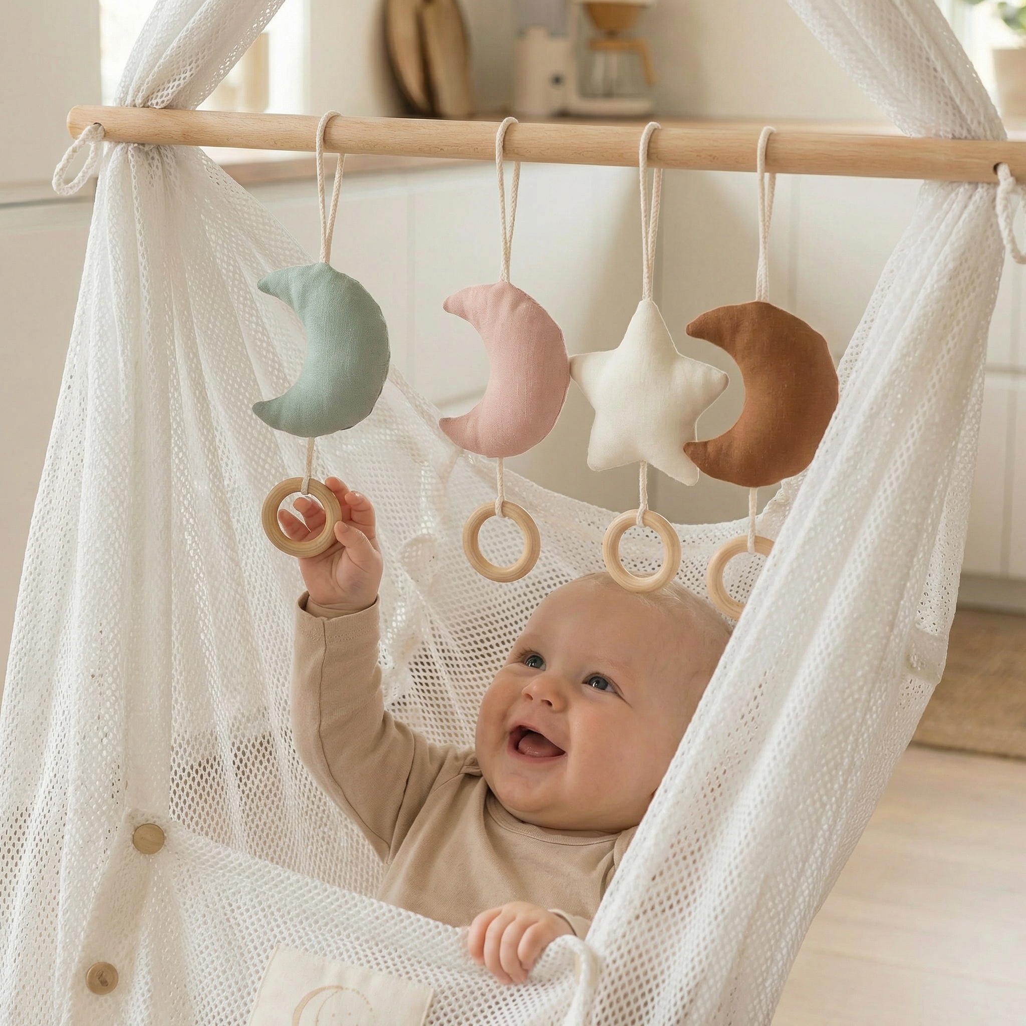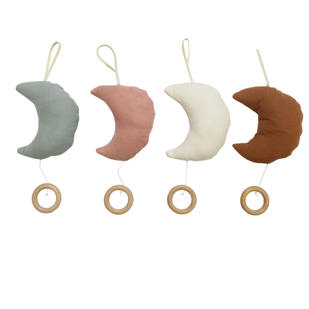 Blødt måneformet hængelegetøj i bomuld med naturlig træring – designet til at stimulere babys sanser i slyngevugge, barnevogn eller aktivitetsstativ.